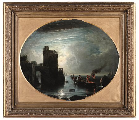 Lot 10 Marina con architetture al tramonto Scuola del XVIII secolo, olio su tela ovale, W. 75 - H. 60 cm