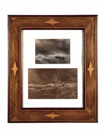 Lot 11 Atlier di Charles Eustache (1820 - 1870), Insieme di cinque disegni entro coppia di cornici in legno lastronato ed intarsiato. XIX-XX secolo, cm 86x72 luce cm 62x47