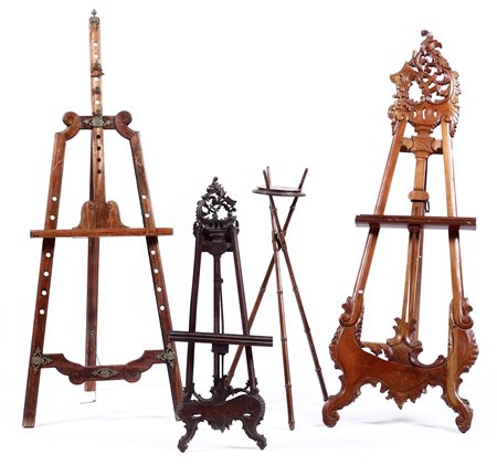 Lot 19 Lotto di tre cavalletti in legno intagliato., nel lotto anche un trespolo portavaso