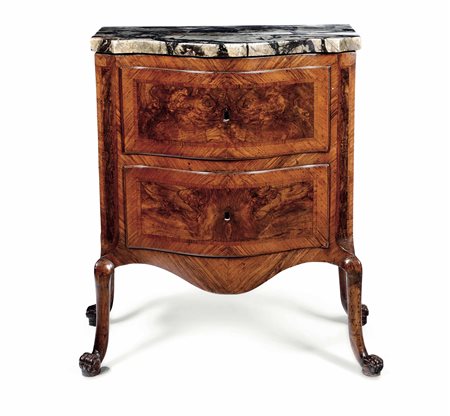 Lot 21 Piccolo cassettone lastronato in radica. XVIII secolo, fronte mosso a due cassetti, piedi ferini, piano in marmo, W. 76 - D. 46 - H. 97 cm