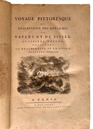 1785 Voyage pittoresque ou description des royaumes de Naples Et De Sicile. Quatrieme Volume. Contenant la Descrition de la Sicile, Parigi 1785 avec approbation et privilege du rol. Primiere partie. Volume integro nella numerazione delle pagine, dorso stampigliato, copertina originale ma scollata. Condizioni complessivamente ottime. -
