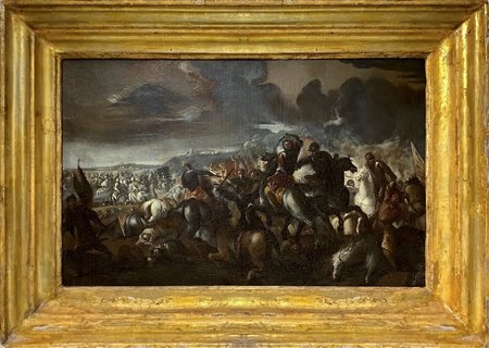 In importante cornice dorata 67x93 cm , in cornice 87x118 cm Battaglia tra milizie cristiane e turche Dipinto a olio su tela