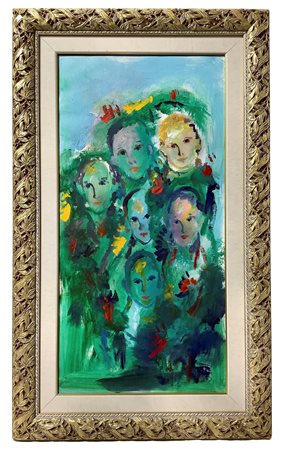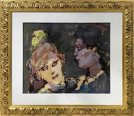 45x55 cm, in cornice 74x84 cm 1962 "Le sorelle" Olio e acquarello su carta intelata Firmato e datato in basso a destra. Certificazione dell'Archivio delle opere del Maestro Mino Maccari, N. rep 3629. Certidicazione dell'autore Mino Maccari. Garanzia di autenticicità e provenienza Galleria Sant'Agostino. -