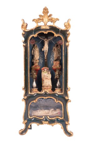 Legno laccato verde e dorato cm 55x23x10 Dipinta sui fianchi e all'interno 5 sculture in alabastro e marmo policromo, raffiguranti Cristo, Madonna, S. Giuseppe e Bambino, S. Anna e Madonna e morte della Madonna -