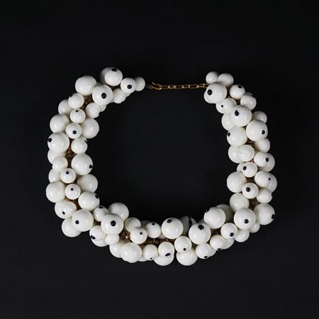 Lot 1 Collana in sfere di vetro bianco puntinate nere di diversa dimensione, l. cm. 36