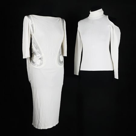 Lot 11 Versace abito bianco a maniche corte di crêpe e paillettes grigie (profilo del collo ingiallito) UNITO a un golf a collo alto in maglia bianca (piccole macchie)