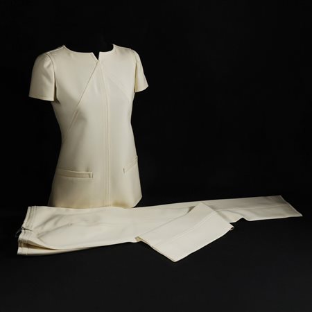 Lot 17 Courrèges tailleur in gabardine di lana bianca composto da casacca a maniche corte e pantalone.