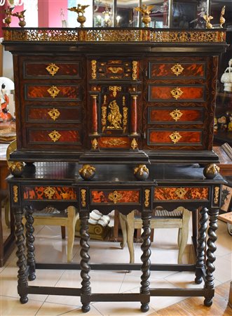 Lot 0002 stipo lastronato in legni vari, ricche guarniture in bronzo, sec.XVII,basamento epoca posteriore