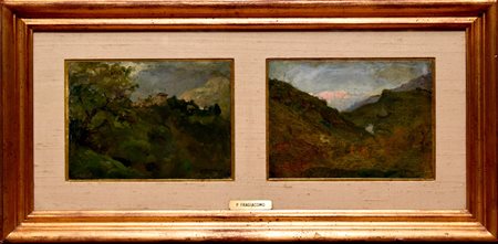 Pietro Fragiacomo 1856/1922 coppia di oli su cartone raff.paesaggi, firmati in basso a destra