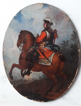 Lot 0020 olio su carta riportata su cartone, raff.uomo a cavallo, firmato in basso a destra, scuola francese sec.XVIII