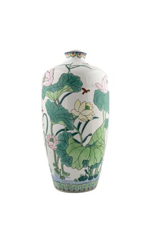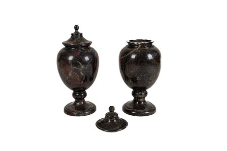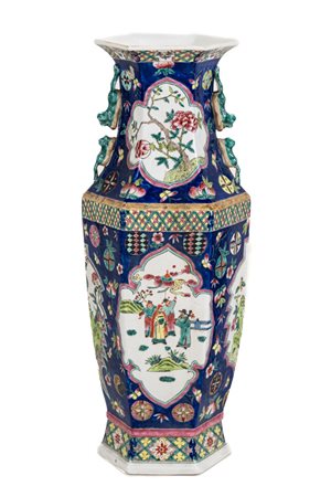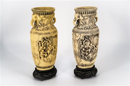 di forma a balaustro, anse a testa di elefante, decorati con scene di genere, su basi in teak intagliato