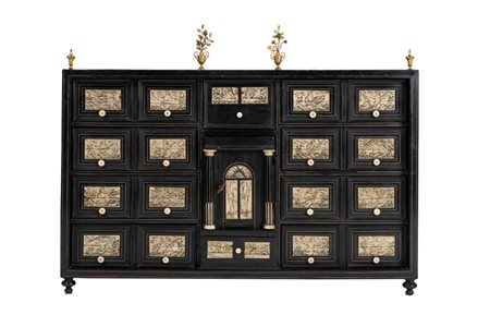 figure mitologiche marine, fronte a dieci cassetti e sportello centrale inquadrato da colonne e decorato con Adamo ed Eva, parte superiore con applicazioni di vasi in bronzo dorato, piedi a cipolla