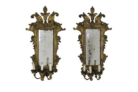cornice sagomata sormontata da cimasa a timpano spezzato e centrata da protome femminile, tre bracci portacandela in ferro battuto ciascuna