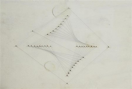 chiodi e fili su tavola dipinta, cm 43x61,5