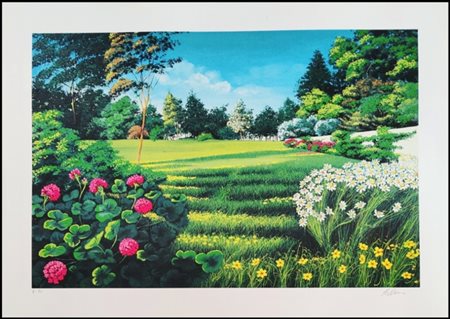 Lot 21 SOAVE MARIO Forte dei Marmi 1955 “Campagna toscana” serigrafia su cartoncino cm. 70x50. Firmata sul fronte in basso a destra, esemplare P.A. a sinistra. Sul retro etichetta di garanzia a cura dell’Istituto Grafico Italiano.