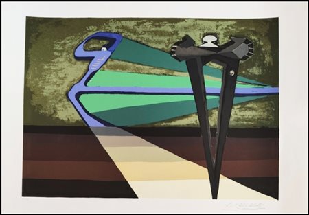 Lot 17 RACCAGNI ANDREA Imola 1921-2005 “Proiezione” serigrafia a 16 colori cm 70x50 (foglio), cm 57,7x41,5 (disegno). Firmata sul fronte in basso a destra, tiratura 83/90 a sinistra. Sul retro etichetta di garanzia a cura di Edizioni Bora.