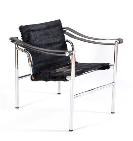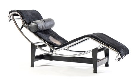 Scocca in metallo cromato poggiante su struttura a quattro piedi nera, seduta rivestita in cavallino, reca al retro della testiera iscrizione incisa con firma “Le Corbusier LC/4 1037”, H cm 63x160x56.5 – H seduta cm 29 (usure – difetti al rivestimento) -