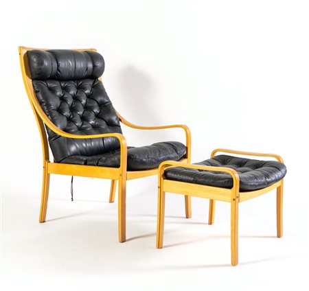 Lot 7 Lotto composto da poltrona e poggiapiedi in legno e skay nero, Italia, fine del XX secolo.