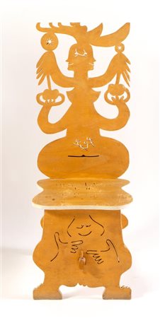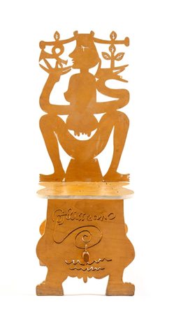 Sedia-scultura antropomorfa in multistrato, presenta sulla seduta e sulle gambe decorazioni e titolo a traforo “Odisseano”, schienale intagliato con profili laccati bianchi, presenta sotto la seduta numerazione 2/10 e firma a fuoco con monogramma, reca al retro etichetta della Galleria d’Arte San Luca – Bologna con autore, titolo, dimensioni e tecnica, H cm 120x45x49 – H seduta cm 46 -