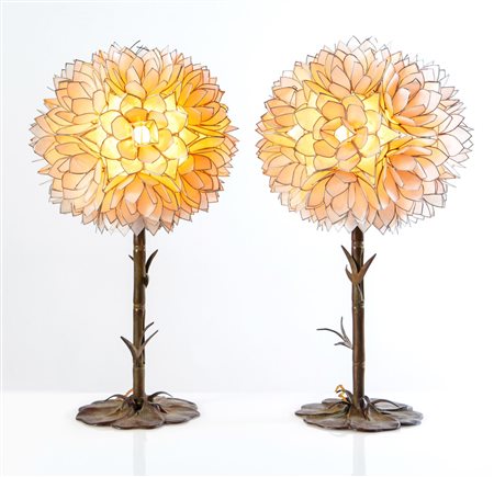 Piede in fusione di bronzo, fusto in ottone a forma di pianta di bambù, complete di paralumi sferici composti da petali di madreperla con finiture in alluminio, H cm 65 – diametro max cm 33 (lievi usure – ossidazioni – mancanze – rotture) -