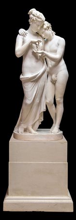 Canova ha certamente molto caro il tema di Amore e Psiche, che realizza in quattro marmi tra il 1787 e 1803, due con le figure abbracciate e due con le figure in piedi una a fianco all’altra, ossia stanti, come nel nostro gesso. Al primo gruppo «di carattere assai caldo e appassionato» si contrappone, a partire dal 1797, forse quale riflessione su un modello statuario antico di Amore e Psiche conservato al Campidoglio e agli Uffizi, il secondo gruppo, in cui l’amore assume valore spirituale e platonico (definizione di Canova: cfr. A. Muñoz, Antonio Canova. Le opere, Roma, 1957, p. 58). Il committente è, in entrambi i casi, prestigioso – il collezionista inglese John Campbell – e le opere, in rapidi cambi di mano, conquistano le sale più prestigiose d’Europa: Gioacchino Murat ne acquista una per tipo destinandole al castello di Villiers-la-Garenne – si tratta delle sculture oggi al Louvre –; l’Imperatrice Josephine de Beauharnais, moglie di Napoleone, compra le altre due per cederle nel 1815 allo Zar Alessandro I di Russia, e queste sono oggi conservate all’Hermitage.