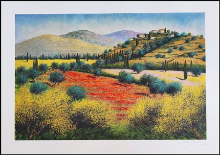 Lot 21 SOAVE MARIO Forte dei Marmi 1955 “Campagna toscana” serigrafia su cartoncino cm. 70x50. Firmata sul fronte in basso a destra, esemplare P.A. a sinistra. Sul retro etichetta di garanzia a cura dell’Istituto Grafico Italiano.
