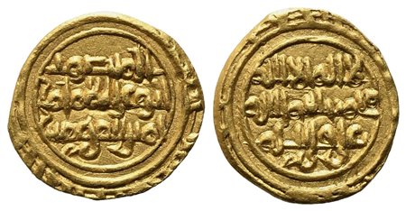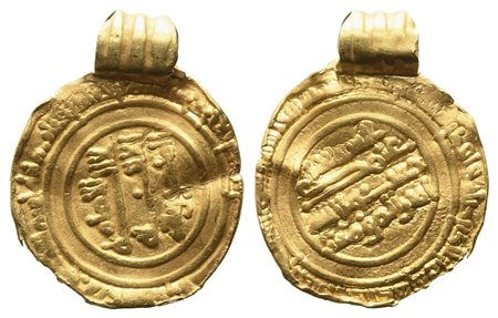 ARAB EMPIRE. Fatimidi. Al-Mansur billah (AH 334-341/AD 946-953). 1/4 Dinar o Robai in oro, con appiccagnolo lavorato d'epoca (anch'esso in oro). Au (15,35 mm – 1,07 g). Nella legenda al D/ in cufico: "al-Imam, non c'e' Dio al di fuori di Allah, al-Mansur billah". Nicol 243. Album 695. Rarissimo, RRR. BB.