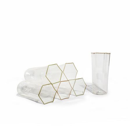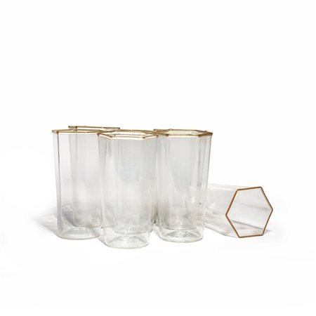 Sei bicchieri esagonali in vetro trasparente con bordo di avventurina.