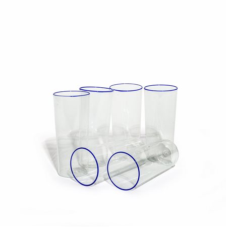 Sei bicchieri in vetro trasparente con bordo blu circa 1925