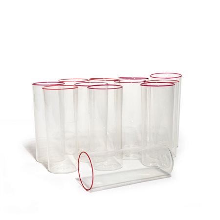 Dodici bicchieri in vetro trasparente con bordo rubino circa 1925