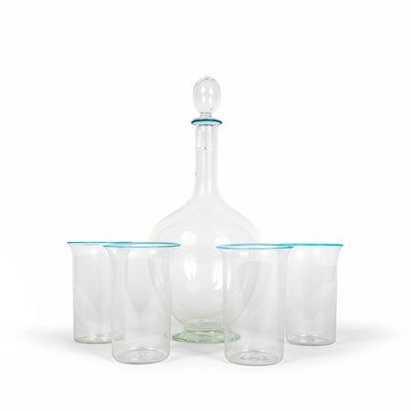 Una bottiglia con quattro bicchieri in vetro trasparente con bordo azzurro circa 1940