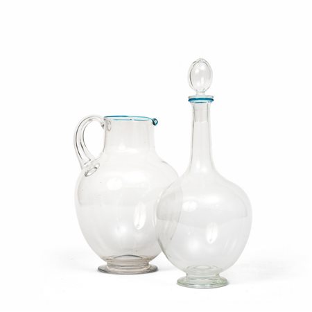 A pitcher and a bottle in transparent glass with azzure rims c. 1940.