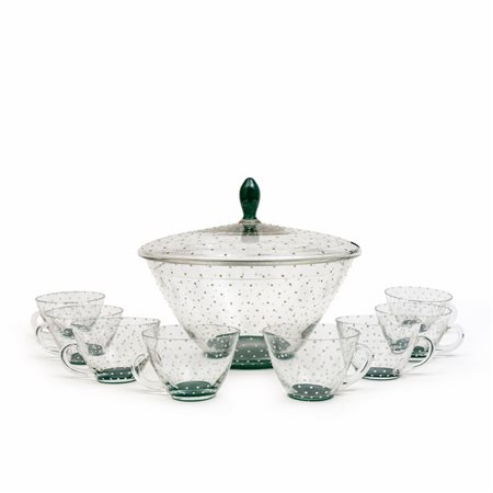 Una coppa con coperchio e otto tazze in cristallo