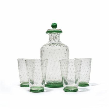A bottle and its top and four glasses in crystal with bubble inclusions and bases in green glass pasta.