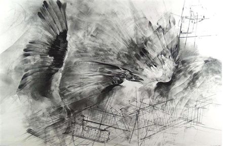 Lot 5 Renzo Vespignani, Tecnica mista su carta, 68x96 cm, Sparvieri su Manhattan, 1992