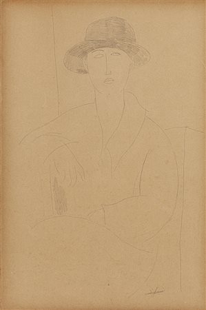 Lot 2 MODIGLIANI AMEDEO (1884 - 1920) Donna seduta con cappello. Matita su carta. Cm 33,00 x 50,00. Firma in basso a destra a matita. Al retro cartigli descrittivi Galleria dello Scudo, Verona; Galleria d'Arte Moderna e Contemporanea Palazzo Forti, Verona; Kunsthaus Zurich, Zurigo; Piccin Trasporti d'Arte, Milano/Venezia; Kunstsammlung Nordrhein-Westfalen, Dusseldorf; Philippe Daverio, Milano; Collezione Mr and Mrs Alsdorf, Winnetka, Illinois; Kunsthalle Bern; Perls Galleries, New York. Certificato di provenienza Philippe Daverio, Milano.
