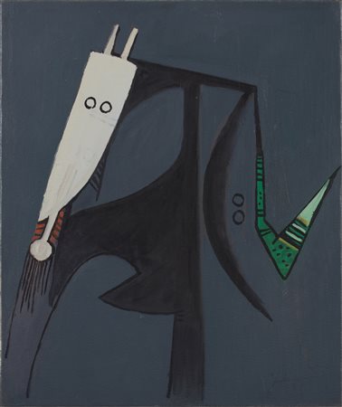 Lot 8 LAM WILFREDO (1902 - 1982) Ritratto. Olio su tela . Cm 55,00 x 65,00. Firma in basso a destra. Al retro cartiglio descrittivo Galleria Nuovo Sagittario, Milano. Autentica dell'artista su fotografia con timbro Galleria Nuovo Sagittario, Milano. Provenienza: Galleria Nuovo Sagittario, Milano; Collezione privata, Rovigo. Pubblicazione: Wifredo Lam: Catalogue raisonné a cura di Eskil Lam (n. 67.07); W.Lam opere scelte a cura di Domenico Porzio, Galleria Nuovo Sagittario, Milano, tav.1. Si ringrazia Eskil Lam per aver confermato l'autenticità dell'opera. Cornice presente