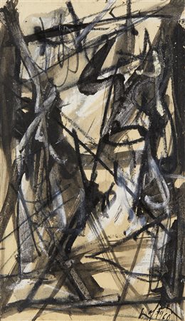 Lot 24 VEDOVA EMILIO (1919 - 2006) Senza titolo. 1960. Inchiostro e pastello su carta incollata su cartoncino. Cm 14,10 x 24,00. Firma e anno in basso a destra. Al retro timbro Huber, Graz. Opera archiviata presso l'Archivio della Fondazione Emilio e Annabianca Vedova, Venezia, riportante il relativo numero d'inventario.