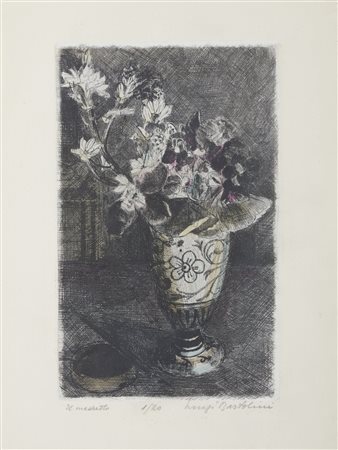 Lot 4 BARTOLINI LUIGI (1892 - 1963) Il mazzetto. Acquaforte. Cm 25,00 x 35,00. 1/20. Titolo, firma e anno in basso a matita. Dimensione lastra: 23.8x14.6 cm. Opera pubblicata nell'Archivio online delle acqueforti di Luigi Bartolini a cura di Dario Palma con la collaborazione di Luciana Bartolini (https://www.luigibartolini.com/i-fiorellini.html) . Pubblicazioni: Calcografia, 1951 Roma; Galleria La Vernice, 1961 Bari; Calcografia, 1962 Roma; Mostra Sala del Castellare, 1997 Urbino. Bibliografia: Le incisioni di Luigi Bartolini, Calcografia Nazionale Roma, C.A. Petrucci, 1951, n. 270 e.u. (I stato), n. 873 e.u.(II stato, ma con misure diverse: 232x185); La Collezione Sebastiano Timpanaro nel Gabinetto Disegni e Stampe dell’Istituto di Storia dell’Arte dell’Università di Pisa, M. Severini, Neri Pozza, Venezia, 1959, n. 501; Catalogo Galleria La Vernice, Bari, 1961; Le incisioni di Luigi Bartolini, G. Ronci, Calcografia Nazionale Roma, n. 270 e.u. 1962 (I stato), n. 873 e.u. (II stato, ma con misure diverse: 232x185); Catalogo ragionato dell’opera grafica di Luigi Bartolini, C. Barsanti, Galleria Marino Roma,1972, n. 298 e.u. (I stato), n. 1001 e.u. (II stato); Catalogo Prandi 222, 2000/2001, n. 55 (II stato). Cornice presente