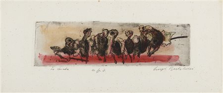 Lot 5 BARTOLINI LUIGI (1892 - 1963) Lo spiedo. Acquaforte a colori. Cm 43,50 x 18,00. 6/10. Tiratura, titolo e firma in basso a matita. Firma in lastra in basso a sinistra.Timbro a secco Luigi Bartolini incisiore in basso a destra. Dimensione lastra: 8.5x29 cm. Difetti.