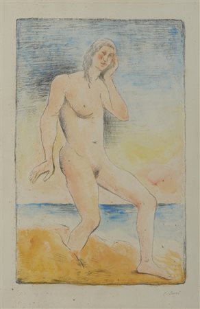 Lot 6 CARRA' CARLO (1881 - 1966) Nudo di donna. 1944. Litografia acquerellata. Cm 32,50 x 50,00. Unico esemplare acquarellato a mano da una cartella di 10 soggetti editi in 100 esemplari. Firma a matita in basso a destra. Autentica su fotografia di Massimo Carrà, Milano. Lievi difetti. Cornice presente