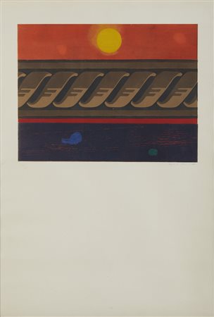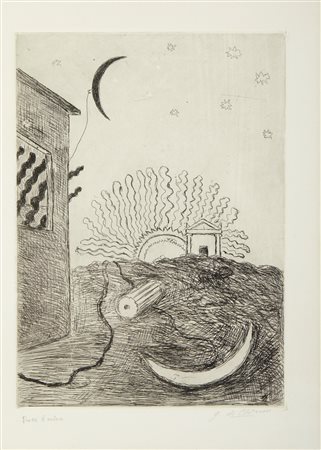 Lot 7 DE CHIRICO GIORGIO (1888 - 1978) Sole e luna. . 1970. Acquaforte. Cm 50,00 x 70,00. Prova d'autore.Tiratura e firma in basso a matita. Timbro a secco in basso a sinistra. Edizione totale: 60 esemplari numerati da 1/60 a 60/60 + 6 prove d'artista+ 6 esemplari colorati a mano. Dimensione lastra: 34.5x24.5 cm. Pubblicazioni: Edoardo Brandani, Giorgio de Chirico. Catalogo dell'opera grafica 1969-1977, Edizioni Bora, Bologna, 1990, p. 15, n. 2; M.Fagiolo, Bologna, 1984; F.Simongini - A. De Angelis, Roma, 1989; F.Ulvi, Ishia, 1989; Policoro 1990. Cornice presente