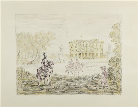 Lot 9 DE CHIRICO GIORGIO (1888 - 1978) Dalla cartella I Cavalli e ville: Antichi Cavalieri e Villa. 1954. Litografia a colori. Cm 60,00 x 46,50. Non numerata. Firma a lastra in basso a destra. Edizione Carlo Bestetti, Roma. Edizione totale: 125 esemplari su carta a mano numerati da 1/125 a 125/125; 5 esemplari contraddistinti dalle lettere a,b,c,d,e, accompagnati ciascuno da una serie speciale stampata su raso di seta bianco; 25 esemplari su carta Japon fuori commercio numerati da I/XXV a XXV/XXV (siglati f.c.); 7 esemplari ad personam per l'artista e collaboratori. Inoltre, sono stati documentati alcuni esemplari con intervento a pastello dell'artista e alcune prove d'autore, nei vari stati, non citate nel colophon della cartella. Pubblicazione: Giorgio De Chirico - catalogo dell'opera grafica, 1921-1969, Edizioni Bora, Roma, 1996, p. 213, tav. 139. Lievi difetti.