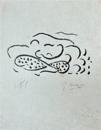 Lot 13 BRAQUE GEORGES (1882 - 1963) Dalla suite "Si je mourais là-bas". 1962. Litografia su carta giappone. Cm 47,00 x 37,00. H.c. Tiratura e firma in basso a matita. Edizione totale: 70 esemplari + h.c. Stampatore: Féquet et Baudier. Editore: Louis Broder. Pubblicazione: Braque - The Complete Graphics, Catalogue Raisonne, Dora Vallier, Gallery Books, W.H. Smith Publishers, NY, 1982, n° 181. Difetti.