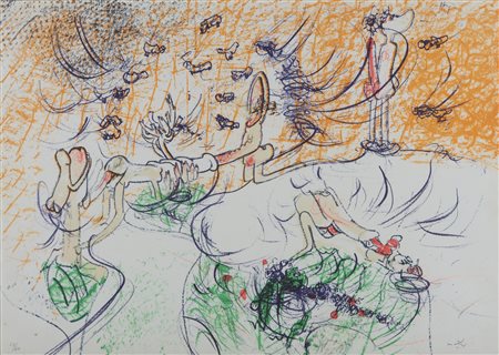 Lot 23 ERNST MAX (1891 - 1976) Dalla cartella Aux petits Agneaux. 1971. Litografia su carta giappone. Cm 25,50 x 33,50. 89/101. Tiratura e firma in basso a matita. Foglio proveniente dalla cartella Patrick Waldberg, Aux petits agneaux composta da n.20 fogli. Editore: Galerie Lucie Weill, Parigi. Pubblicazione: Max Ernst - The graphic work, Colonia 2004, a cura di Spies Werner. Edizione totale: 101 esemplari + 73 p.d.a. Cornice presente