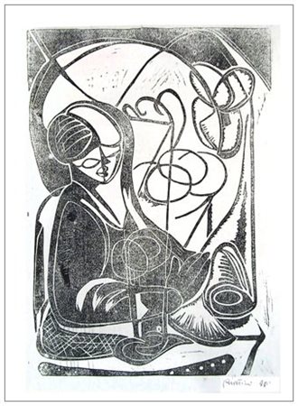 Lot 4 GIANNI BERTINI Pisa 1922 – Caen (Francia) 2010 Senza titolo 1948 Linoleumgrafia es.épreuve d'artiste. Firma e data in b. a d.; firma, tecnica e scritta di esemplare in b. al c. sul passepartout della cartellina. (50 x 31,5 foglio – 36 x 25 lin.)