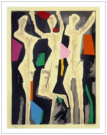 Lot 10 MARINO MARINI Pistoia 1901 – Viareggio 1980 Personagges du Sacre du Printemps – tav.V 1974 Litografia a 10 colori es.71/75. Firma in b. a d. (65 x 50 foglio – 52 x 39,5 lito.) L’opera fa parte dell’omonima cartella di 8 litografie. Tiratura: 3 es. nominativi + X es. num. romani su carta Japon Nacré + 75 es. num. arabi su carta Arches + XXXV es. num. romani fuori commercio. Pubbl.: “Marino Marini Catalogo Ragionato dell’Opera Grafica (incisioni e litografie) 1919 – 1980)” a cura di Giorgio e Guido Guastalla, Livorno, 1990, Editore Graphis Arte, Livorno, p.175, L 118 + p.244, L 118.