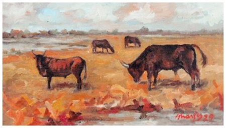 Lot 15 FRANCO MASSEI Pisa 1925 – 2006 Tori in campagna 1976 Olio su cartone telato 20 x 35. Firma e data in b. a d.; sul verso etichetta e firma dell’artista.