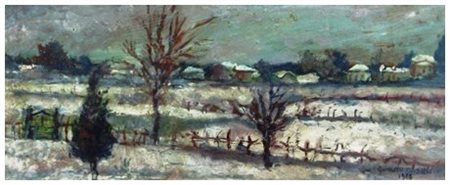 Lot 17 GIORGIO CASINI Pisa 1908 – 1984 Nevicata 1968 Olio su faesite 26 x 63. Firma e data in b. a d.; sul verso titolo e firma + etichetta e firma galleria IL Navicello, Pisa.