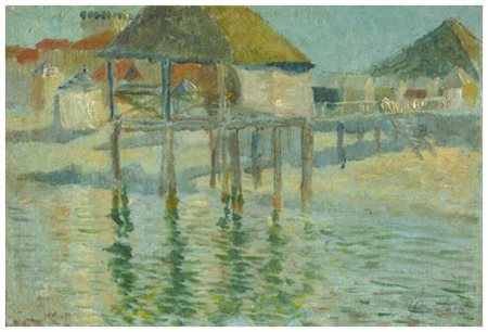 Lot 22 SANTI MACCHIA Pisa 1884 – 1964 Stabilimento balneare a Marina di Pisa anni ‘20 Olio su cartone 15,5 x 22,7. Firma in b. a d. Autentica e archiviazione Saletta Viviani – Silvio Guarasci, Pisa su foto. Pubbl.: “Santi Macchia” cat. mostra a cura di Silvio Guarasci, Saletta Viviani, Pisa, 24 novembre 2001 – 13 gennaio 2002, p.42. Questa veduta ritrae la spiaggia prospiciente a Piazza Gorgona dove vi erano il bagno Alma di Pilade Ghelardi detto “il Beo”, il bagno La Tazza d’Oro della famiglia Lotti e il bagno Rosa di Zeffiro Garzella; sullo sfondo a sinistra è riconoscibile la torretta della villa Carovigno.